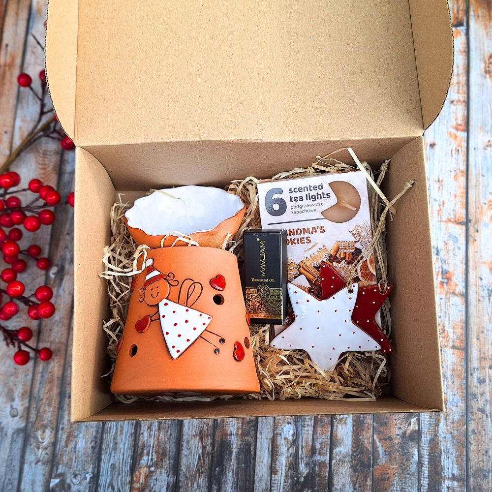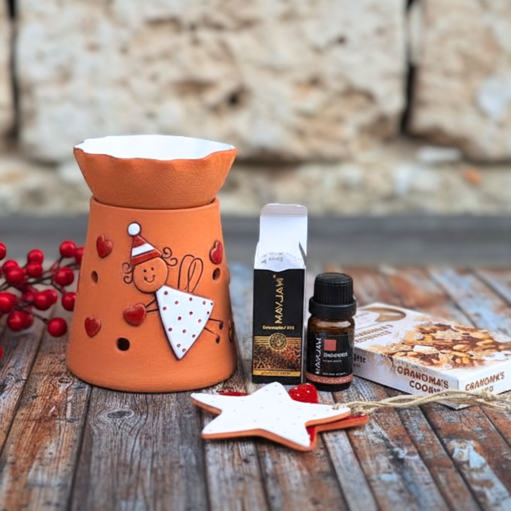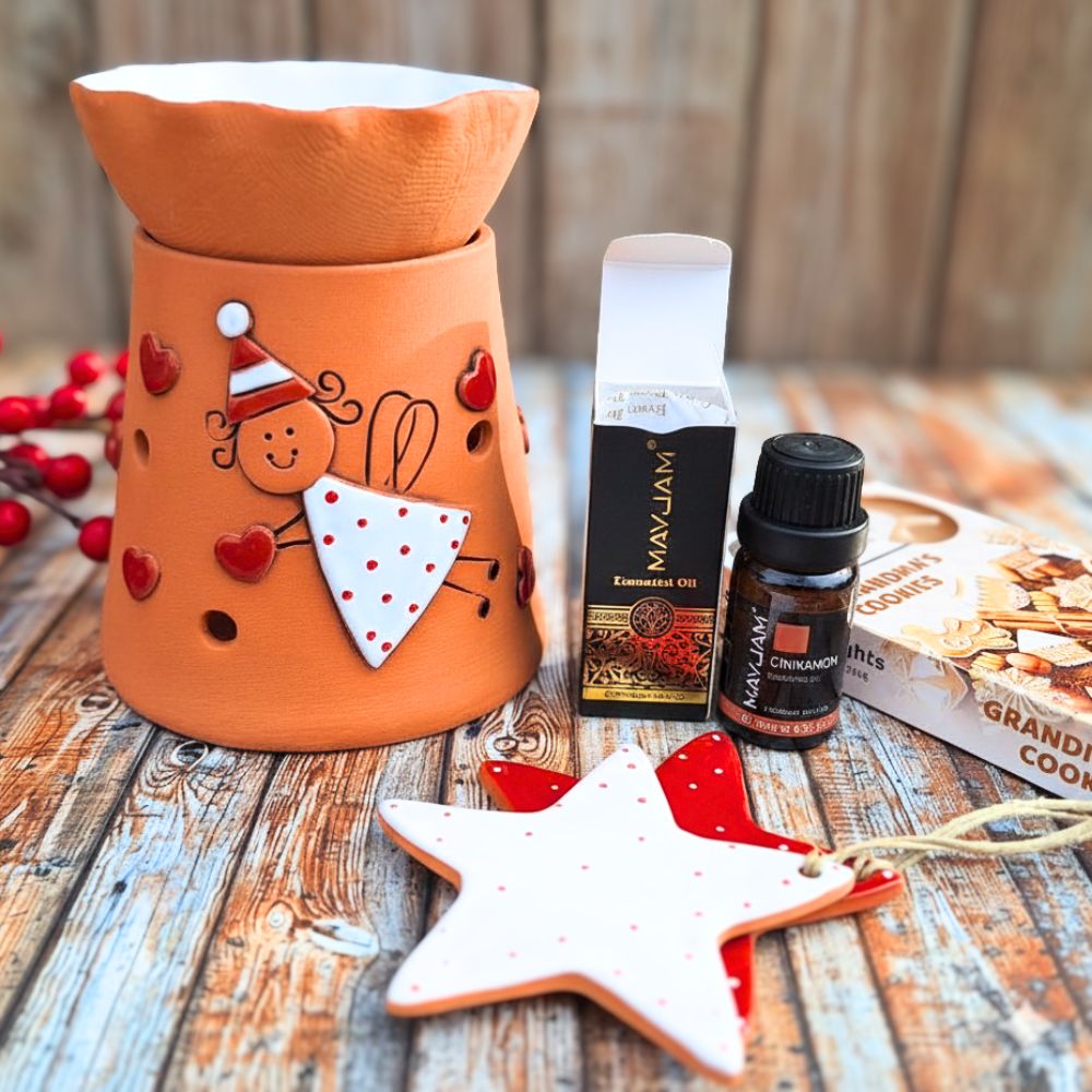 Praznični darilni paket z ročno izdelanim keramičnim izparilnikom, eteričnim oljem cimeta, dišečimi svečkami in zvezdicami. Popolno darilo za tople decembrske večere.