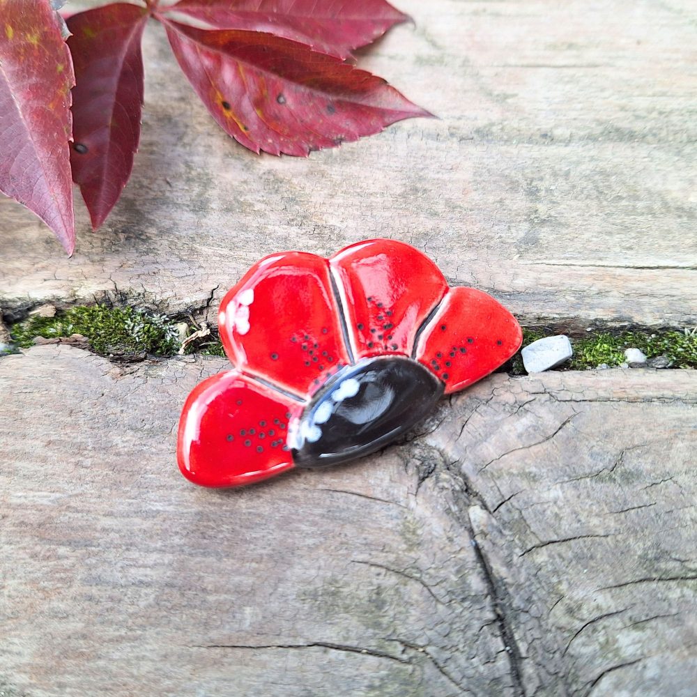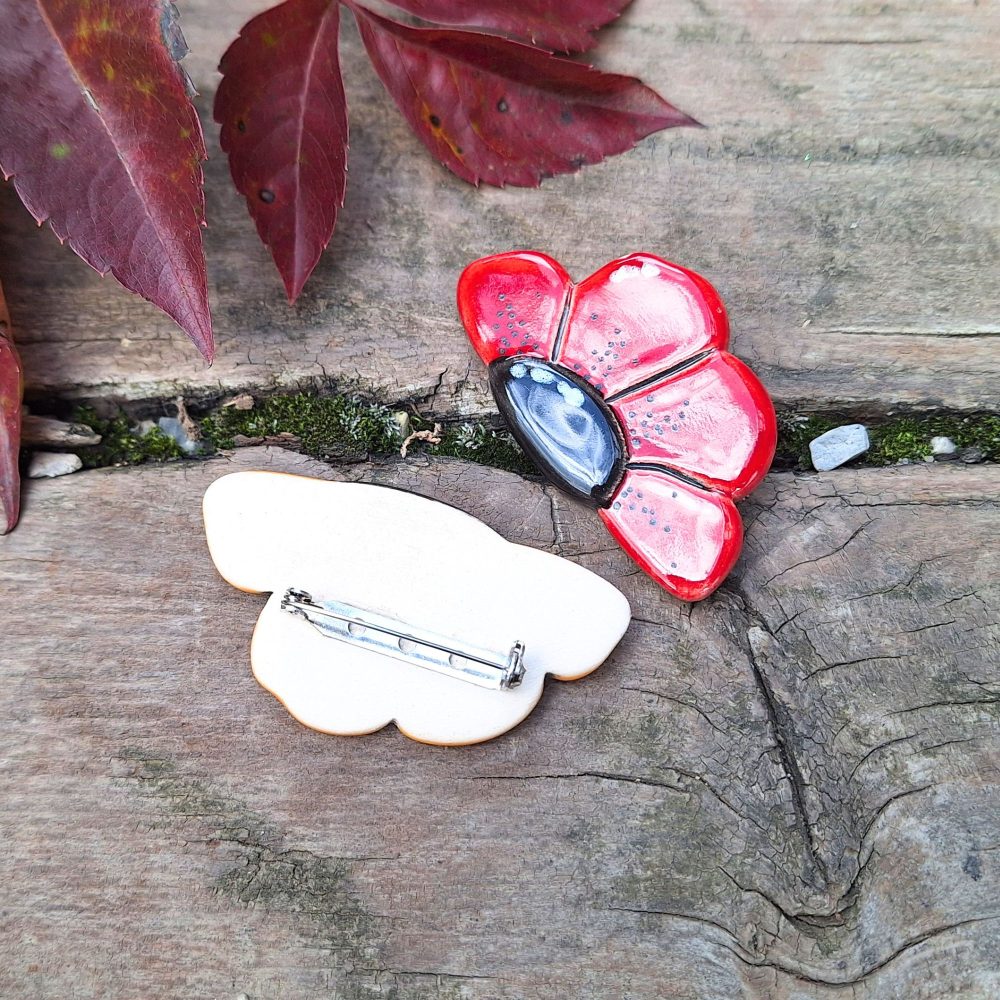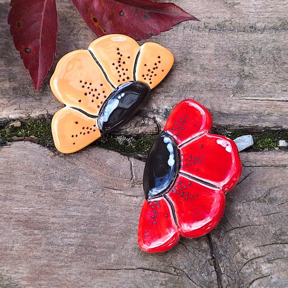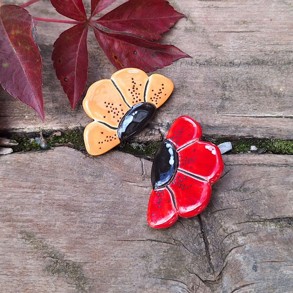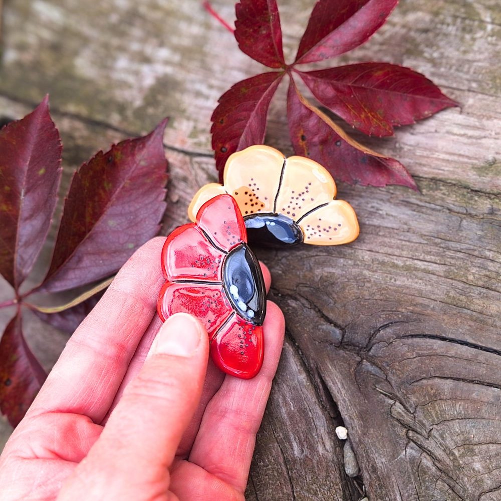 Unikatna keramična broška v obliki rožice. Ročno izdelan nakit v rdeči ali rumeni barvi – popoln jesenski modni dodatek za jakno, torbico ali šal.