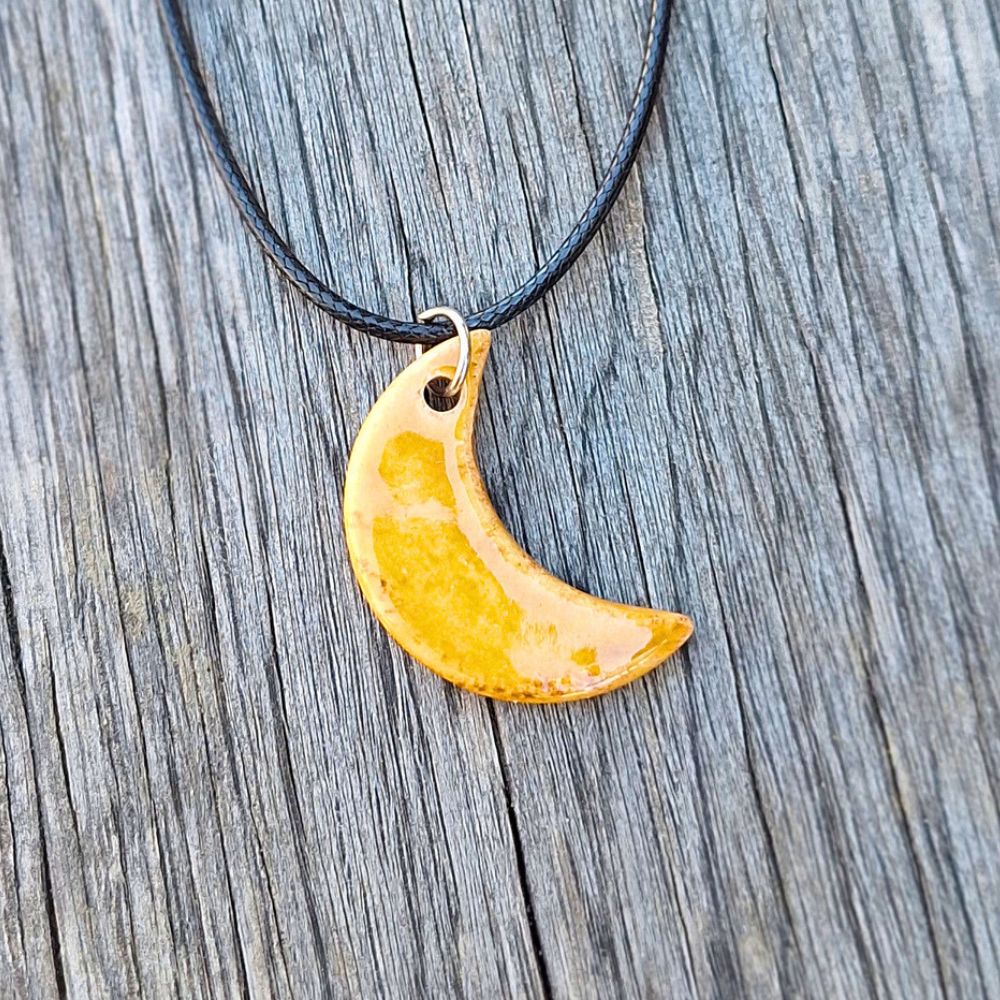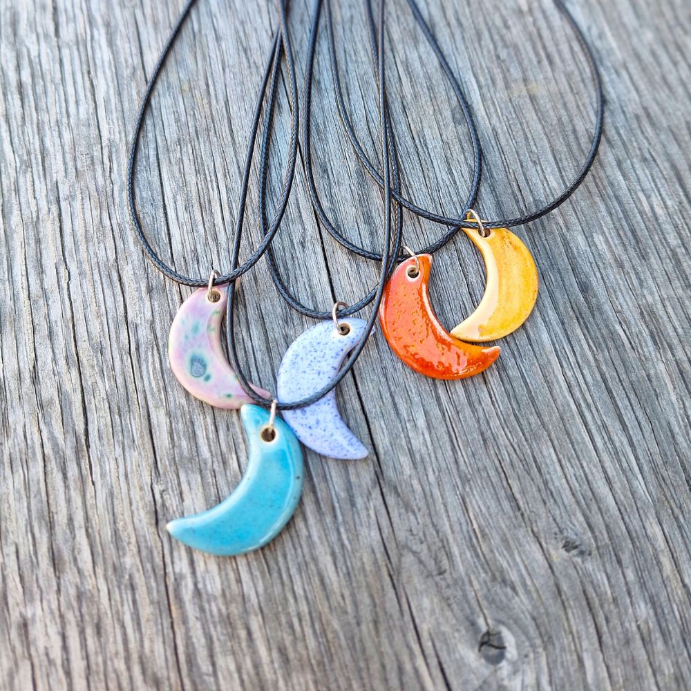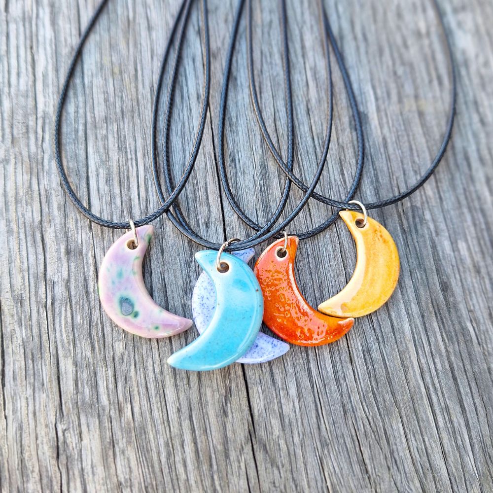 Keramični obesek Luna je ročno izdelan unikaten nakit v obliki polmeseca. Na voljo v več barvah, lahek, gladek in prijeten za nošenje – popolno darilo z nežno simboliko.