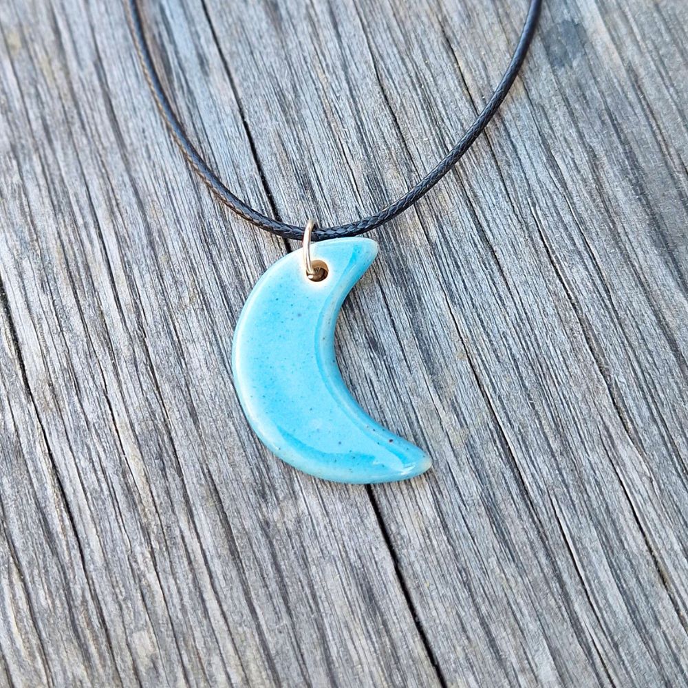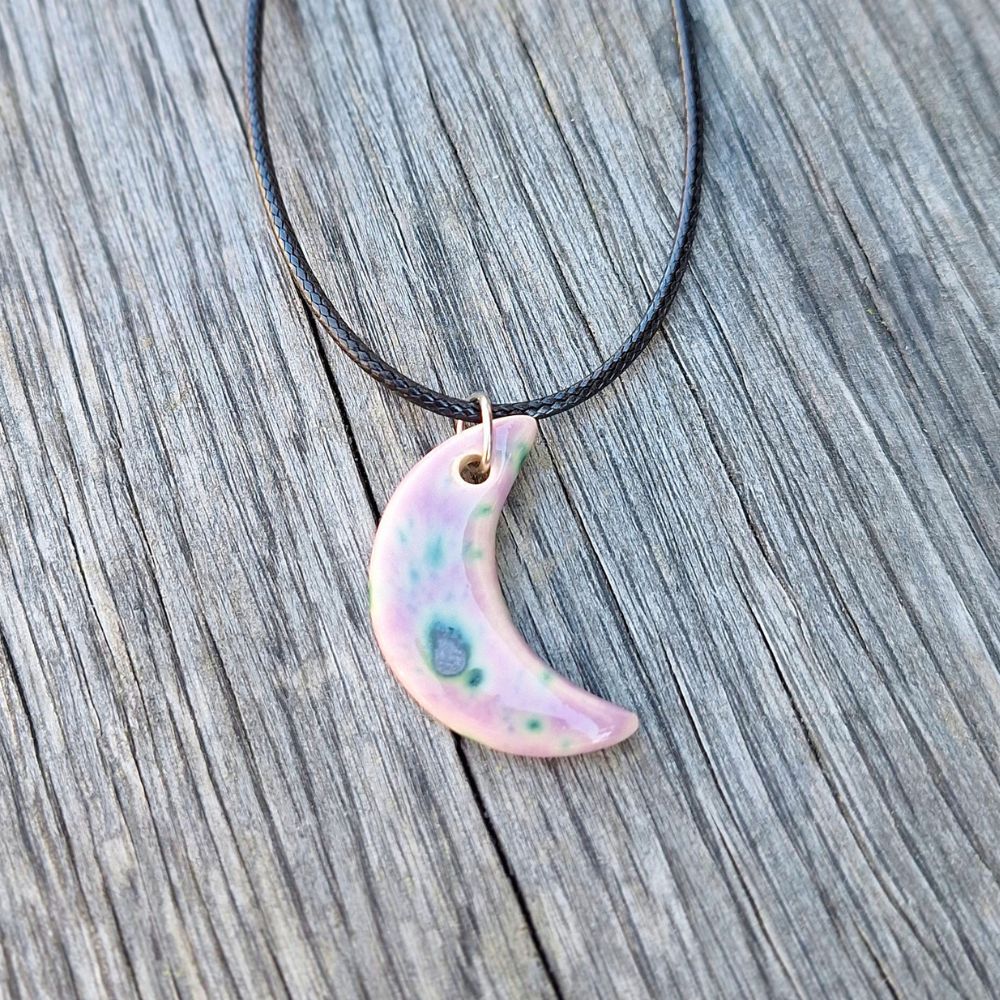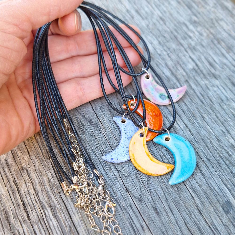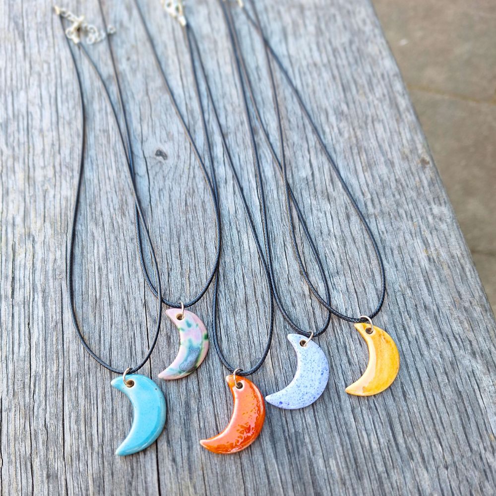 Keramični obesek Luna je ročno izdelan unikaten nakit v obliki polmeseca. Na voljo v več barvah, lahek, gladek in prijeten za nošenje – popolno darilo z nežno simboliko.