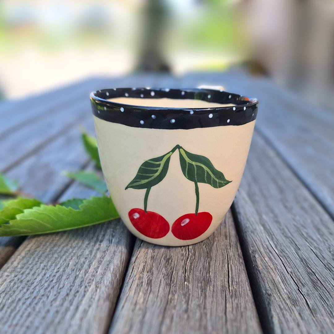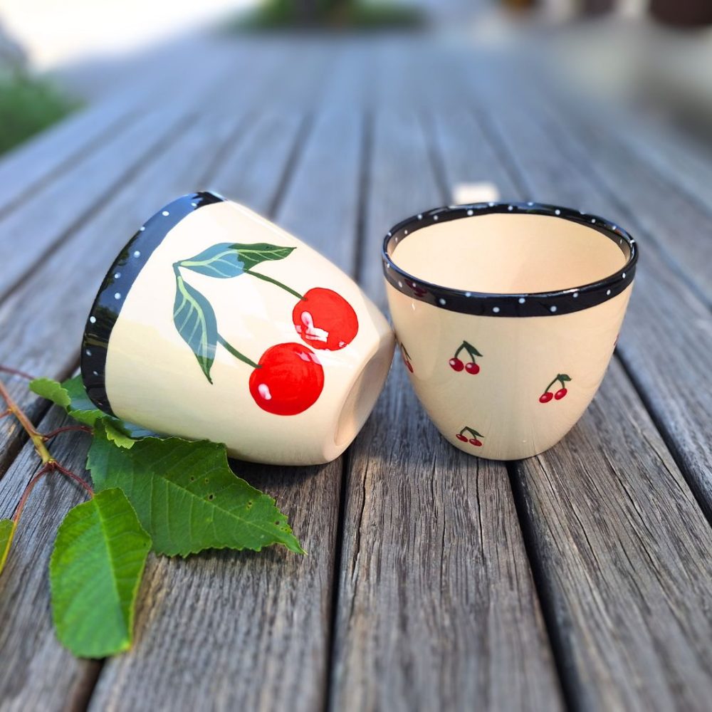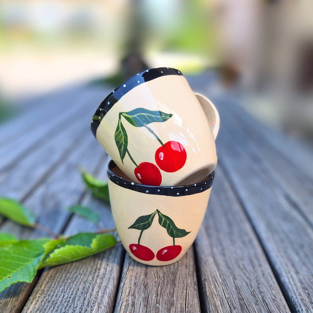 Ročno poslikana skodelica s češnjami je idealna za čaj, kakav ali kuhano vino. Izbirate lahko med dvema stiloma – vsak s čarom poletja!