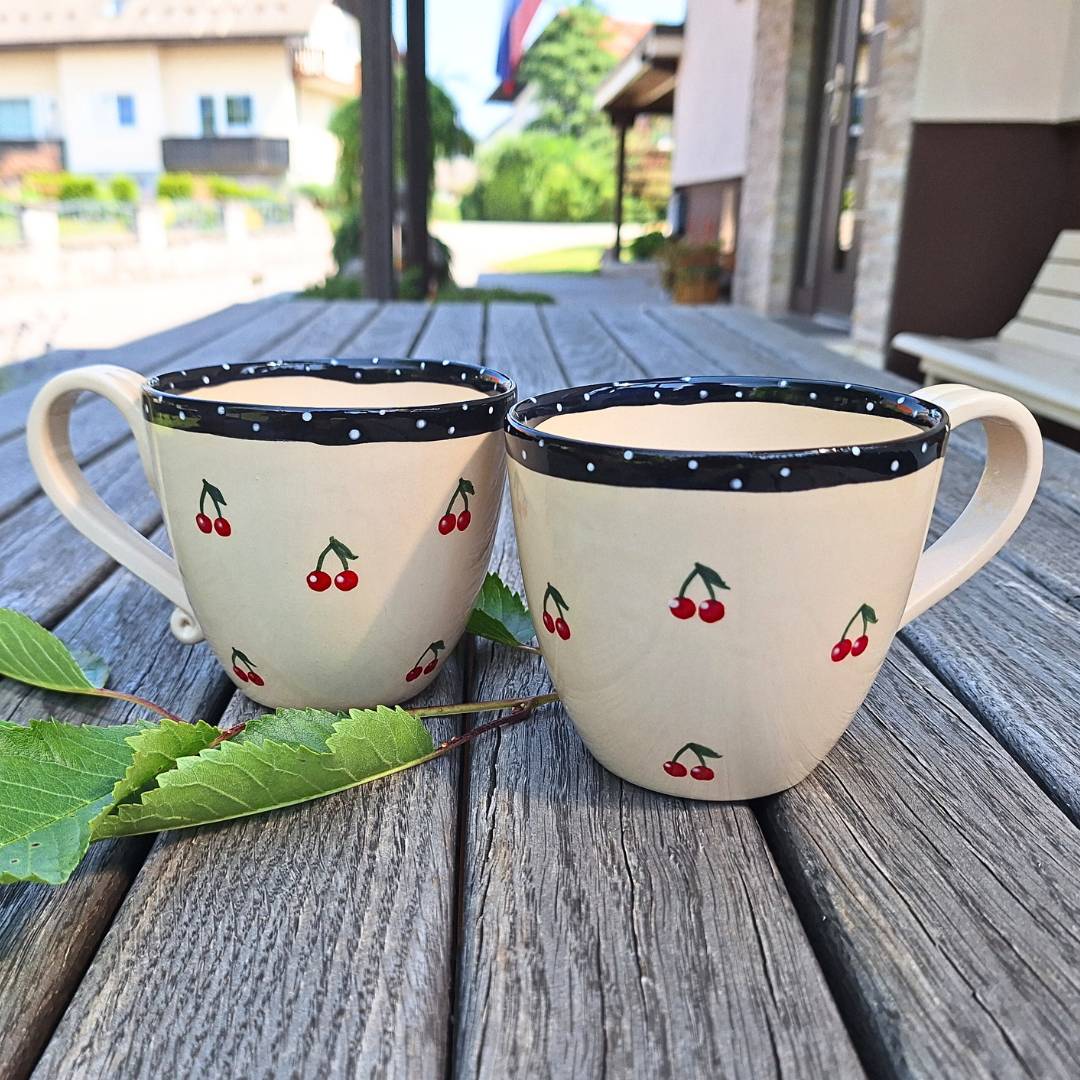 Vsaka skodelica je ročno oblikovana in poslikana z motivom rdečih češenj. Izbirate lahko med dvema stiloma: