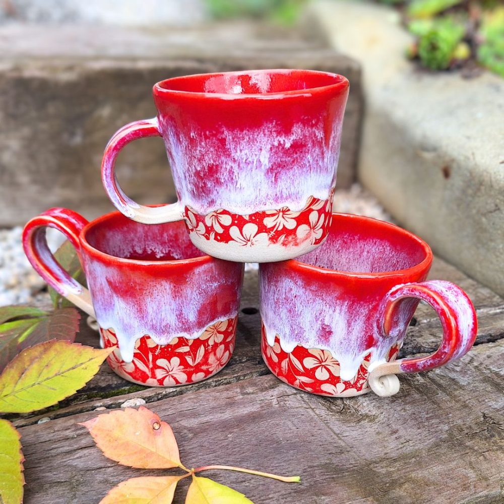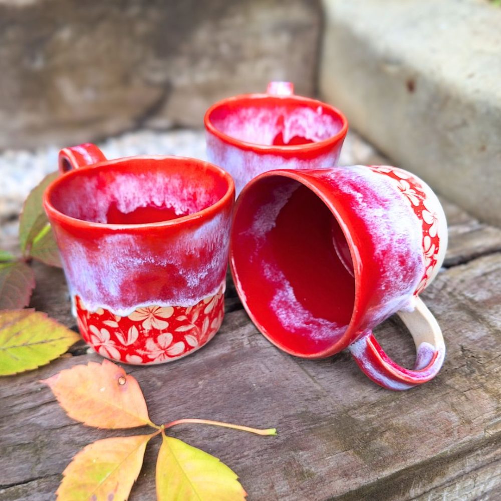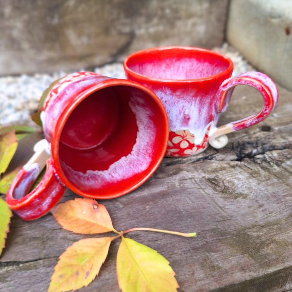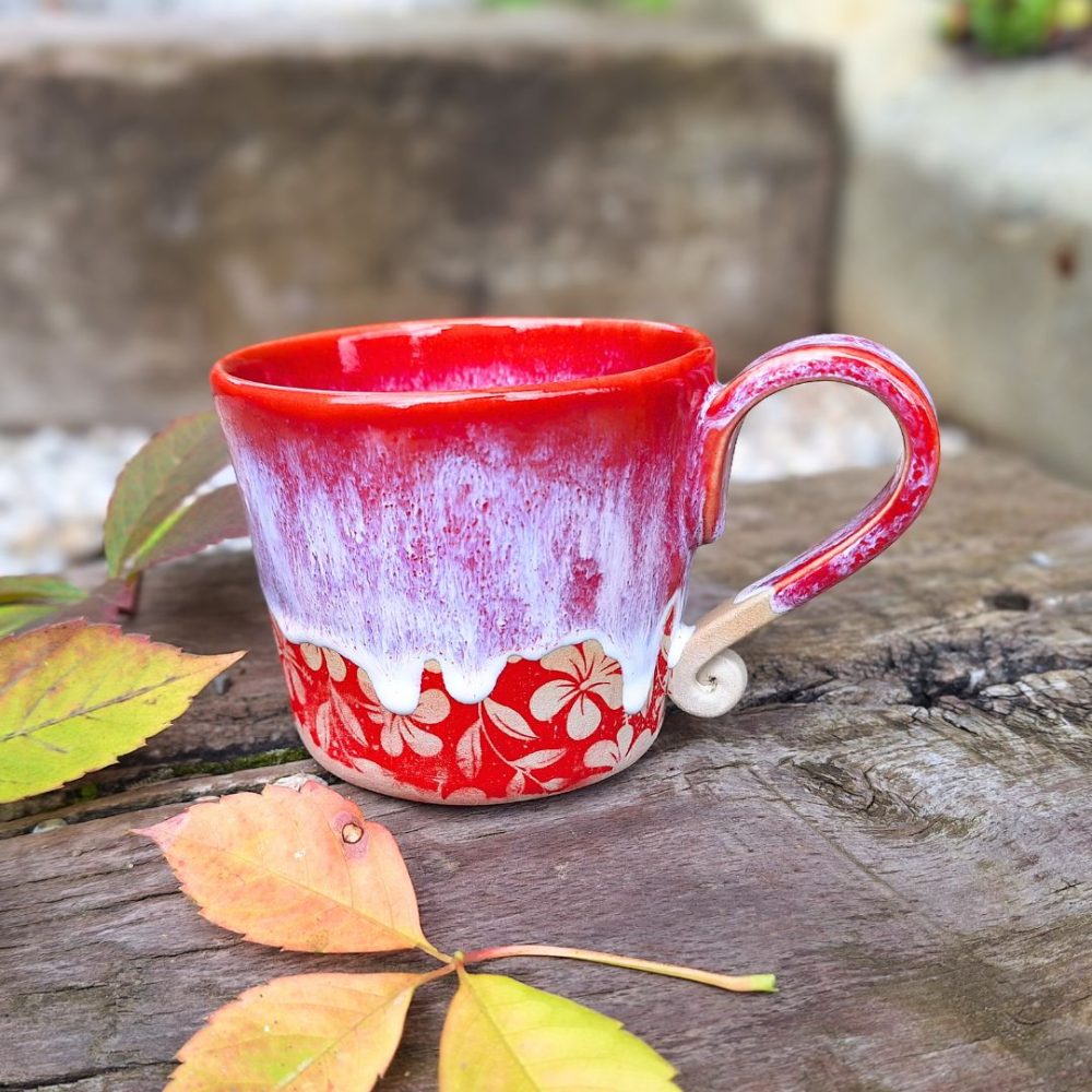 Notranjost skodelice in zgornji zunanji rob je pobarvan je z rdečo in belo glazuro, ki ustvari lepo prelivanje barv. Glazure so primerne za stik s hrano, kar pomeni, da lahko brezskrbno uživate v svoji najljubši kavi ali čaju, ne da bi se morali bati za vaše zdravje.