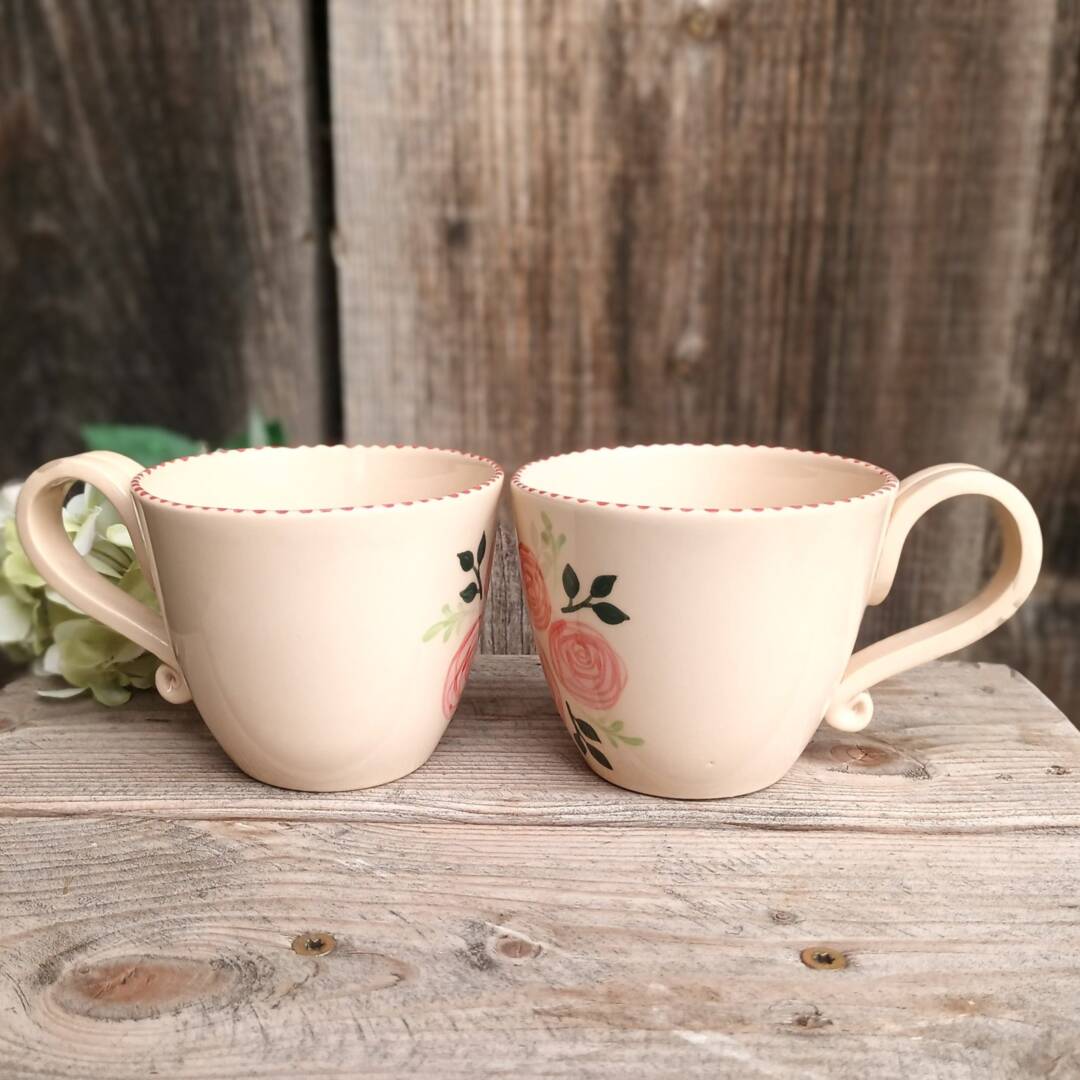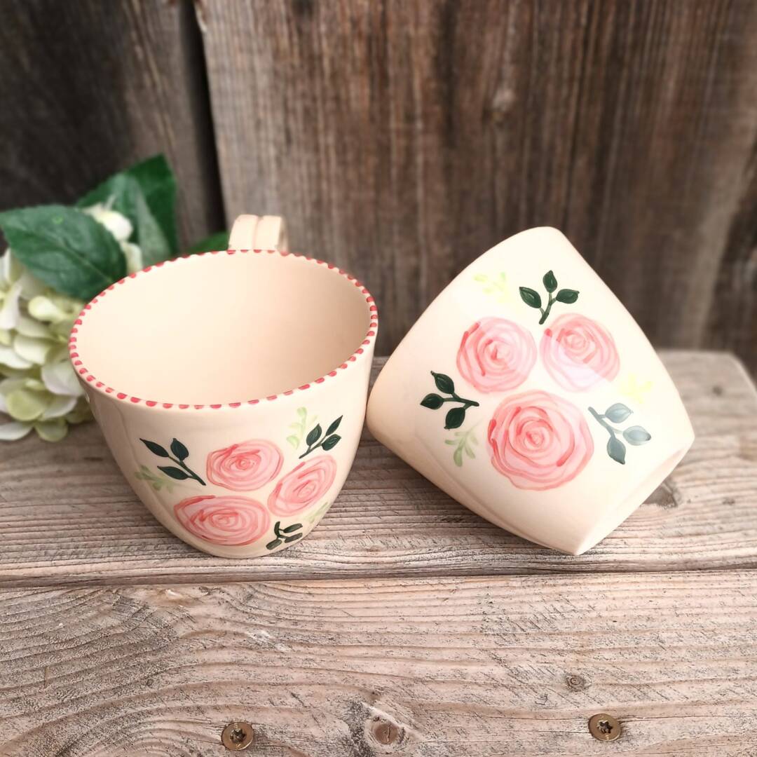 Ta čudovita skodelica z vrtnicami je del moje romantične kolekcije z vrtnicami in je ustvarjena za vse, ki si želijo svoj vsakdan polepšati z nežnim dotikom ročno izdelane keramike.