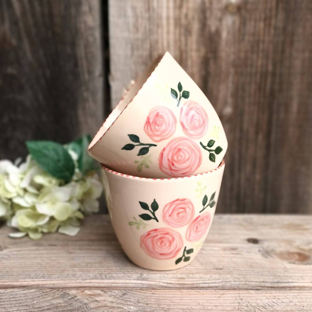 Vsaka skodelica je ročno poslikana z nežnimi roza vrtnicami, ki ustvarjajo čaroben, romantičen videz. Linije so mehke, barve umirjene – kot nalašč za trenutke, ko si želite malo počasnosti, topline in lepote.