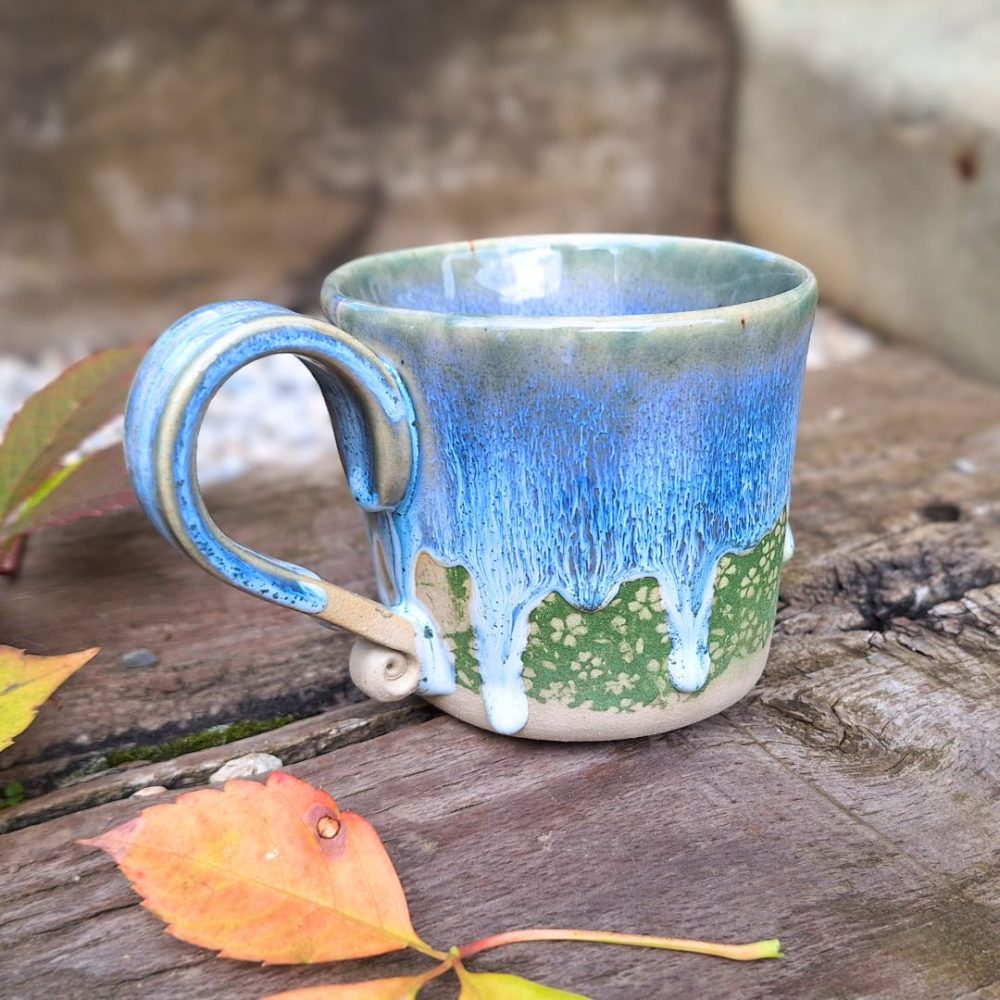 Notranjost skodelice in zgornji zunanji rob je pobarvan je z zeleno in belo glazuro, ki ustvari lepo prelivanje barv. Glazure so primerne za stik s hrano, kar pomeni, da lahko brezskrbno uživate v svoji najljubši kavi ali čaju, ne da bi se morali bati za vaše zdravje.